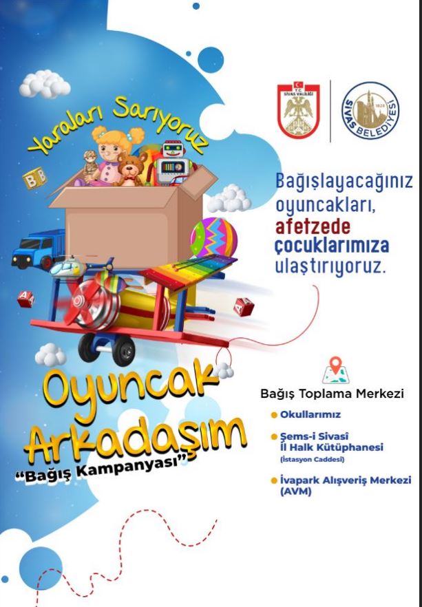 Sivas Valiliği ve Sivas Belediyesi öncülüğünde depremzede çocuklara ulaştırılmak üzere "çocukların yüzü oyuncaklarla gülecek" bağış kampanyası başlatıldı.