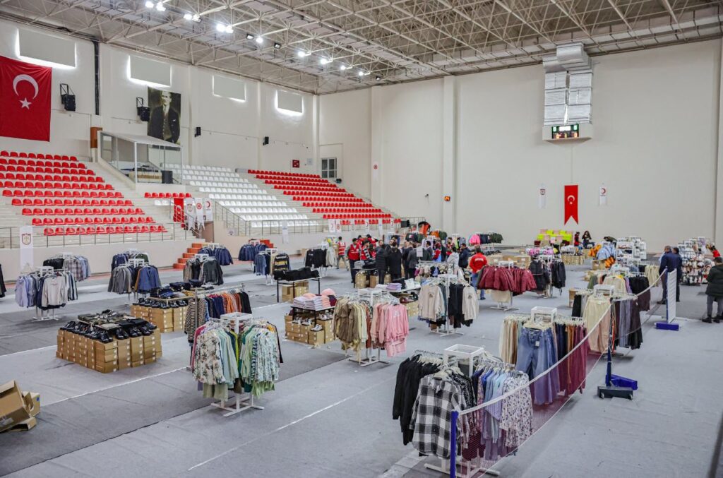 SCÜ Taha Akgül Spor Salonunda oluşturulan mağazada gıda, kıyafet, ayakkabı ve hijyen malzemesi gibi ürünler depremzedelere ücretsiz olarak sunuluyor.