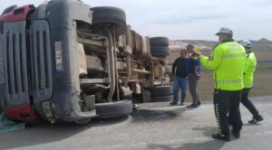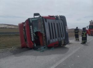 Kayseri’den gelip Sivas’ın Divriği ilçesine giden H.K. (48) yönetimindeki 38 GJ 006 plakalı Scania marka tır ve tıra bağlı hafriyat dorsesi bilinmeyen bir nedenle yoldan çıkarak şarampole devrildi. Kaza sürücü H.K. ağır yaralandı.