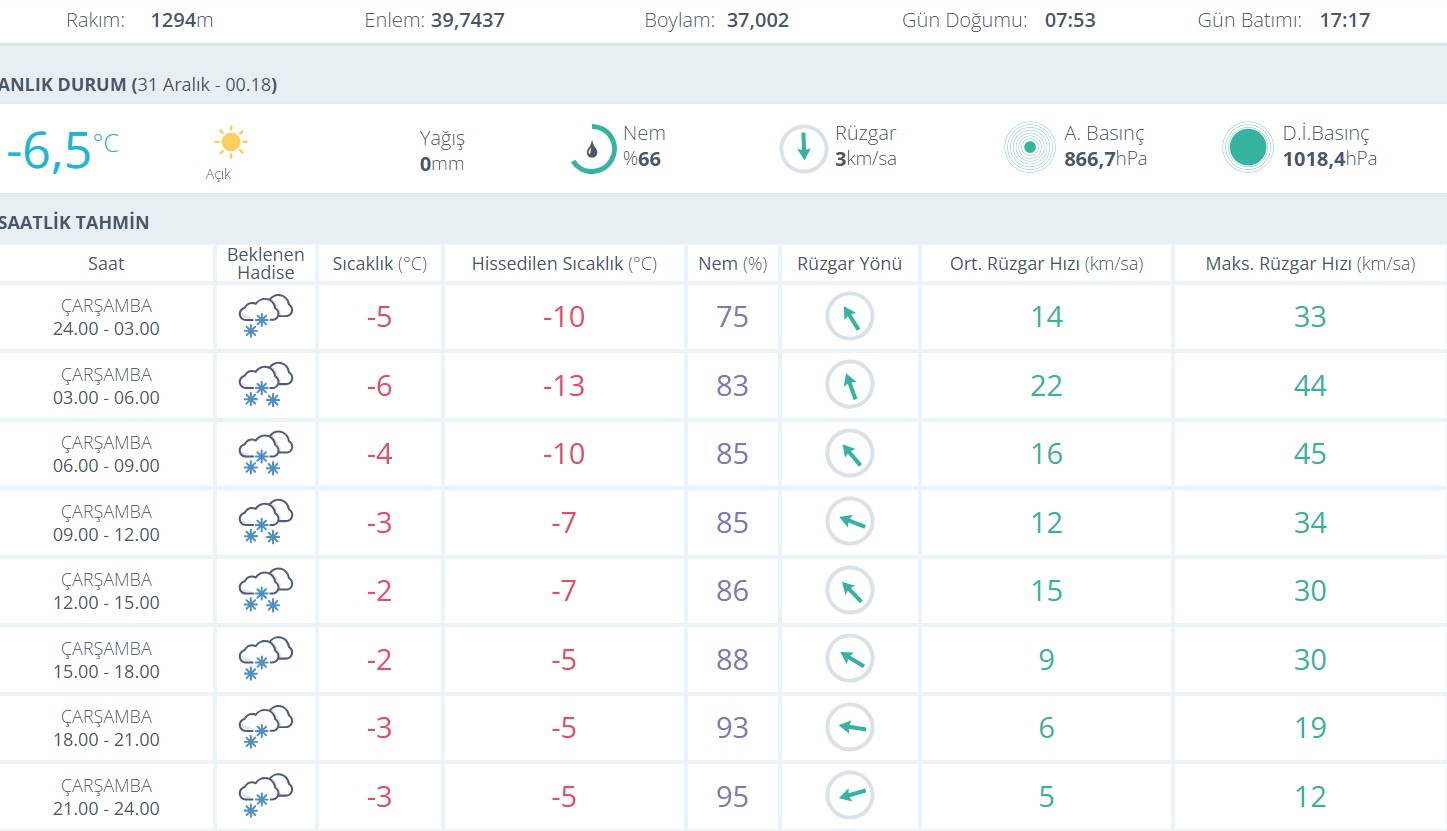 Saatlik tahminlere göre, gece 24.00 ile 03.00 saatleri arasında sıcaklığın -5 dereceye, hissedilen sıcaklığın ise -10 dereceye kadar düşeceği öngörülüyor. Sabahın ilk saatlerinde ise soğuk hava etkisini daha da artıracak. 03.00 ile 06.00 saatleri arasında sıcaklığın -6 dereceye gerilemesi, hissedilen sıcaklığın ise -13 dereceyi bulması bekleniyor. Bu saatlerde rüzgâr hızının artmasıyla birlikte soğuk hava daha sert hissedilecek.