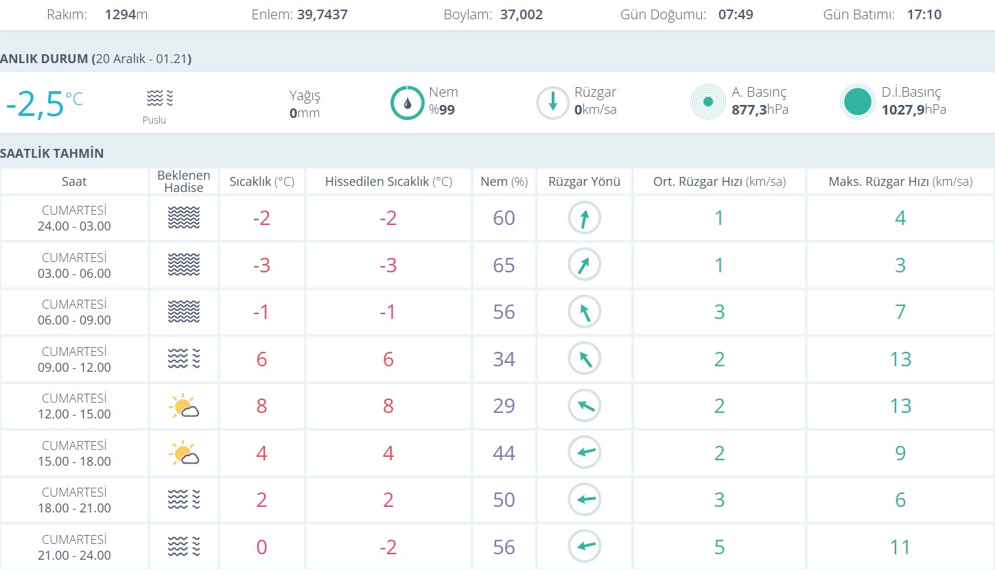 Saatlik tahminlere göre gece boyunca sıcaklık eksi değerlerde seyrederken, sabahın erken saatlerinde hava -1 derece civarında olacak. Sabah saatlerinden itibaren sıcaklıklarda hızlı bir artış beklenirken, öğle saatlerinde termometrelerin 8 dereceyi göstermesi öngörülüyor. Gün içerisinde parçalı bulutlu bir havanın hâkim olması beklenirken, akşam saatlerinden sonra sıcaklık yeniden düşüşe geçecek.