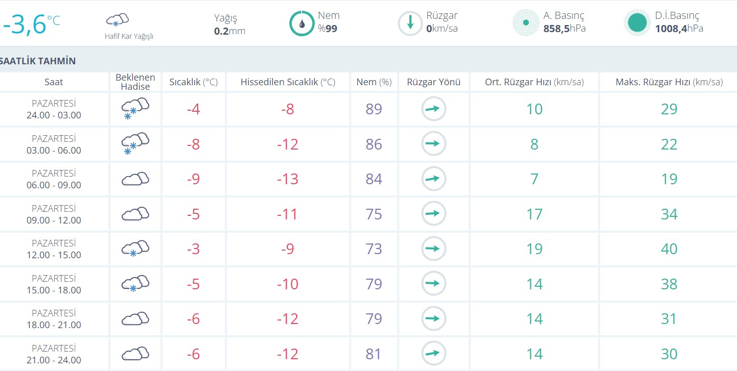 Meteorolojik verilere göre sıcaklıklar gün boyunca sıfırın altında seyrederken, hissedilen değerler daha da düşük seviyelere iniyor. Hafif kar yağışı ve kuvvetli rüzgârla birlikte don ve buzlanma riski artmış durumda.