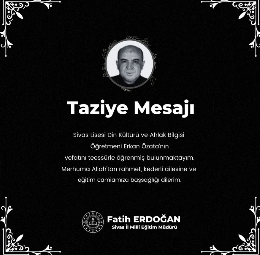 Sivas İl Milli Eğitim Müdürü Fatih Erdoğan, yayımladığı taziye mesajında derin üzüntüsünü dile getirdi. Erdoğan mesajında, “Sivas Lisesi Din Kültürü ve Ahlak Bilgisi Öğretmeni Erkan Özata’nın vefatını teessürle öğrenmiş bulunmaktayım. Merhuma Allah’tan rahmet, kederli ailesine ve eğitim camiamıza başsağlığı dilerim.” ifadelerini kullandı.