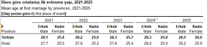 Ortalama ilk evlenme yaşında da yükseliş görüldü. 2025 yılında Sivas’ta erkeklerde ortalama ilk evlenme yaşı 28,2, kadınlarda ise 25,9 olarak açıklandı. Bu verilerin bir önceki yıla göre artış gösterdiği kaydedildi.