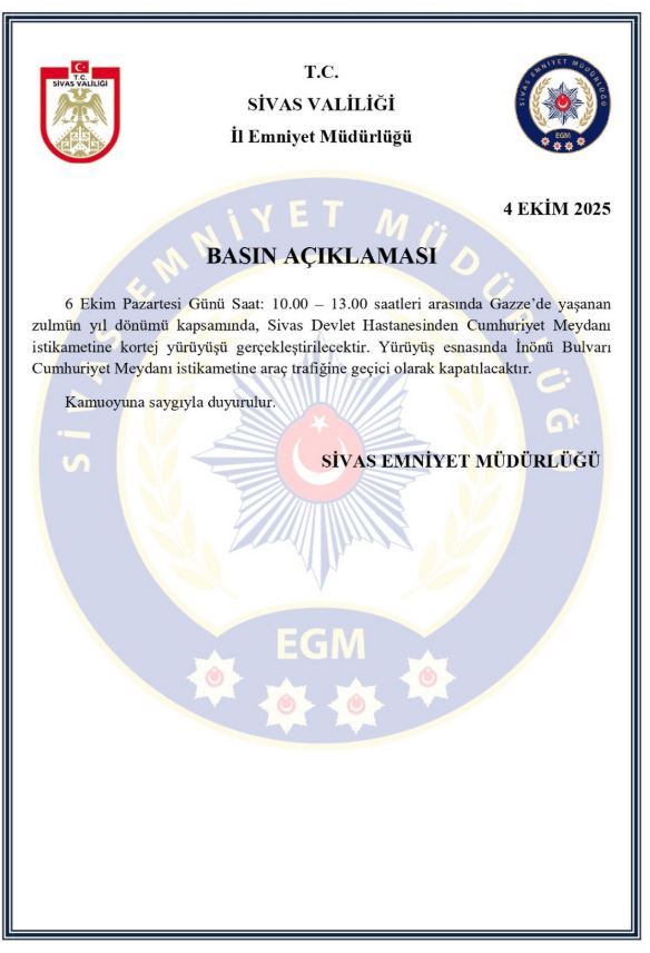 Sivas Valiliği İl Emniyet Müdürlüğü, 6 Ekim Pazartesi günü yapılacak yürüyüş nedeniyle kent merkezinde bazı yolların geçici süreyle trafiğe kapatılacağını duyurdu.