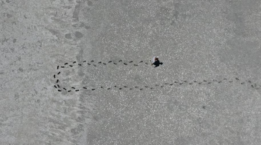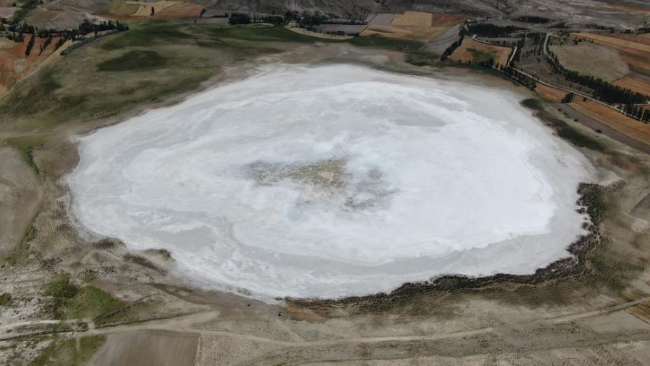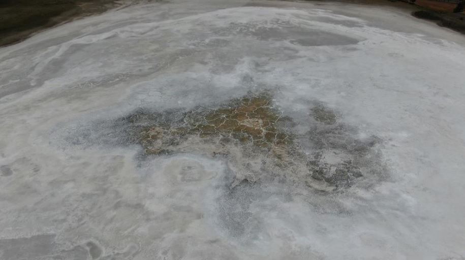 Ayın yüzeyini de andıran beyaz tabaka drone ile havadan görüntülendi. Bozkırın ortasında bembeyaz kalan göl, endişelendirse de ortaya kartpostallık görüntüler çıkardı.