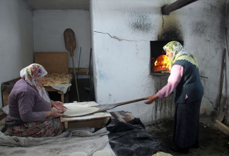 Sivas'ın Hafik ilçesinde gönüllü kadınlar, merkez üssü Kahramanmaraş olan depremlerde mağdur olan vatandaşlar için mahalle fırınlarında ekmek yapıyor.