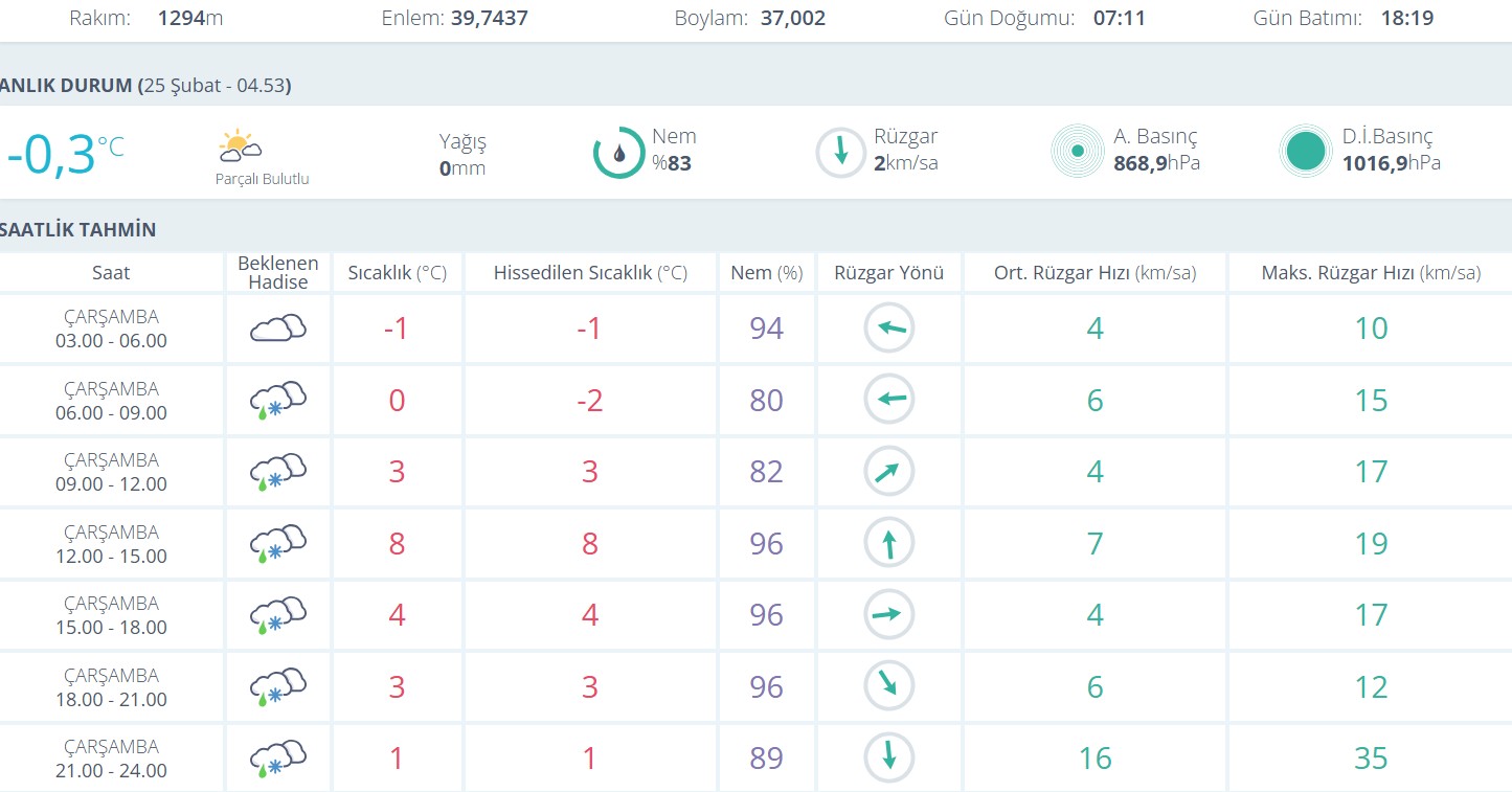Saatlik tahminlere göre 03.00–06.00 saatleri arasında sıcaklığın eksi 1 dereceye kadar düşmesi beklenirken, bu saatlerde yüksek nem oranı nedeniyle sis ve buzlanma riskinin artabileceği ifade edildi. Sabah saatlerinde ise karla karışık yağış ihtimali öne çıkıyor.