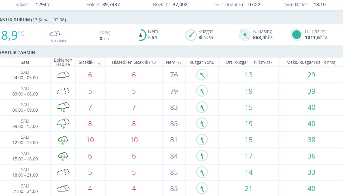 Gece saatlerinden itibaren başlayan bulutlu hava, sabah saatlerinde yer yer yağışla birlikte devam edecek. Sabah 06.00 ile 12.00 saatleri arasında sıcaklıkların 7–8 derece civarında seyretmesi beklenirken, öğle saatlerine doğru sıcaklığın 10 dereceye kadar yükselmesi öngörülüyor. Öğleden sonra ise hava sıcaklıklarında yeniden düşüş yaşanarak akşam saatlerine doğru 5–6 derece seviyelerine gerilemesi bekleniyor.
