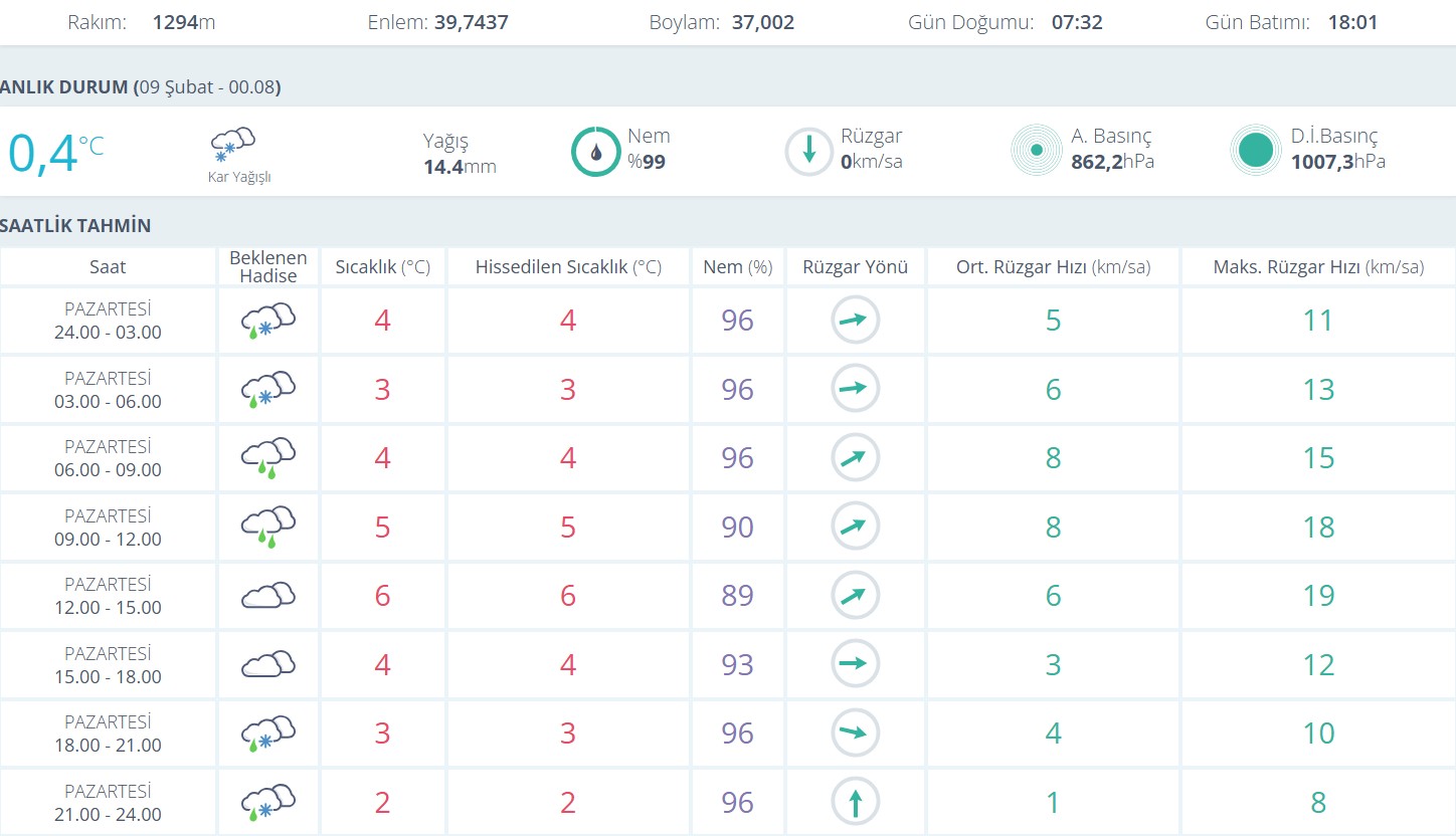 Saatlik tahminlere bakıldığında gece yarısından sabah saatlerine kadar yağışlı havanın etkisini sürdürmesi, sıcaklıkların ise 3–4 derece aralığında seyretmesi öngörülüyor. Sabah saatlerinden öğleye doğru hava sıcaklığının 5–6 dereceye kadar yükselmesi beklenirken, öğleden sonra yeniden düşüş yaşanacağı tahmin ediliyor. Akşam ve gece saatlerinde ise sıcaklıkların 2–3 derece seviyelerine gerileyerek yeniden karla karışık yağmur ihtimalini artıracağı ifade ediliyor.