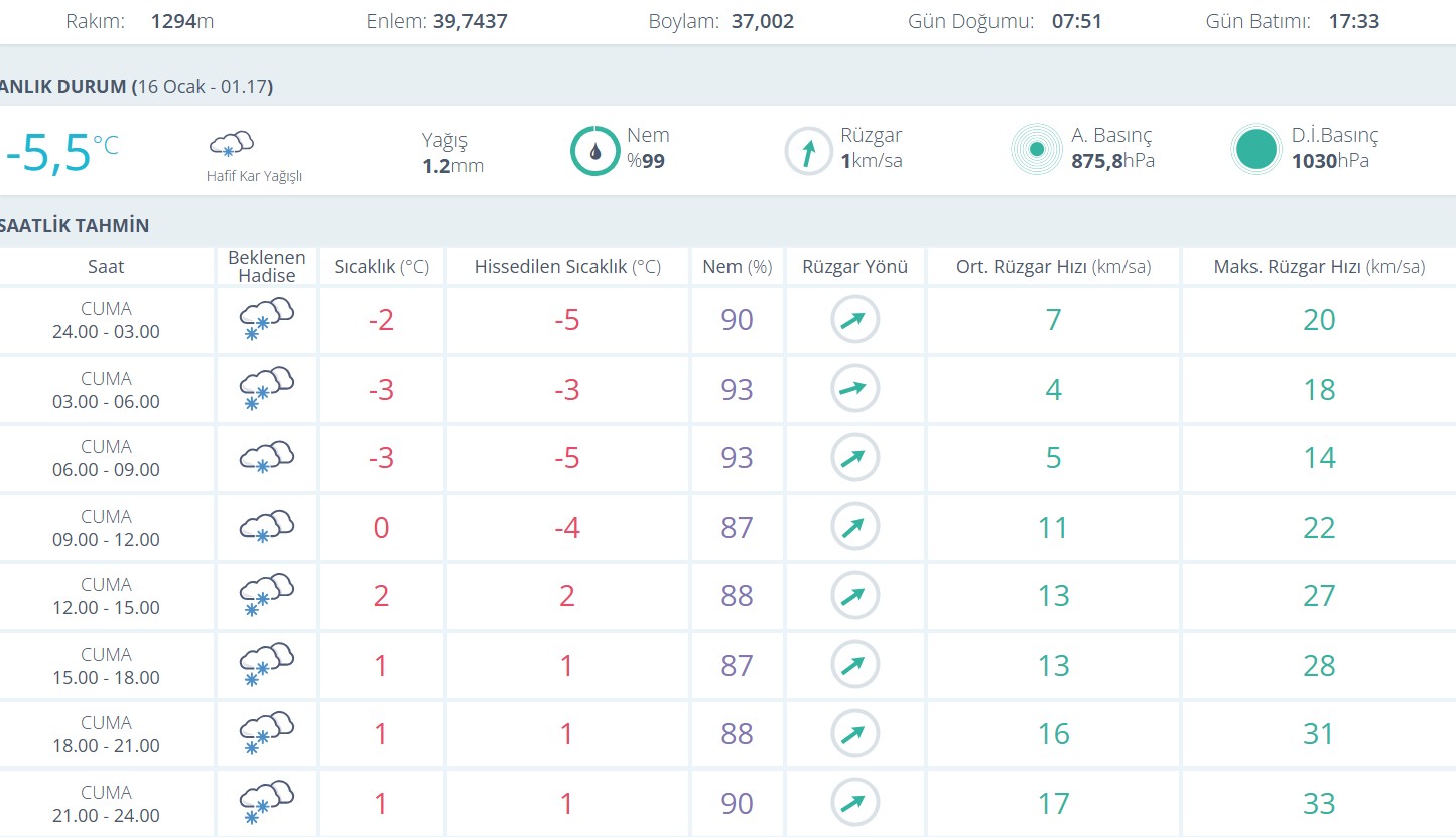 Saatlik tahminlere göre cuma günü gece yarısından sabah saatlerine kadar kar yağışının aralıklarla devam etmesi bekleniyor. 00.00–03.00 saatleri arasında hava sıcaklığının eksi 2 derece, hissedilen sıcaklığın ise eksi 5 derece civarında olacağı tahmin ediliyor. Sabahın erken saatlerinde sıcaklık eksi 3 dereceye kadar düşerken, hissedilen soğuk da etkisini artıracak.