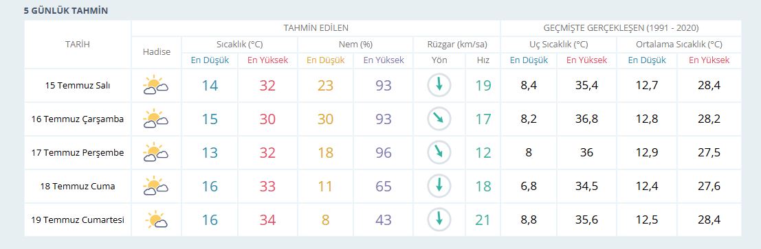 Sıcaklıklar biraz daha artıyor. En düşük 16°C, en yüksek 33°C. Nem oranı %11-%65 arasında. Rüzgar kuzeyden 18 km/saat hızında esecek.