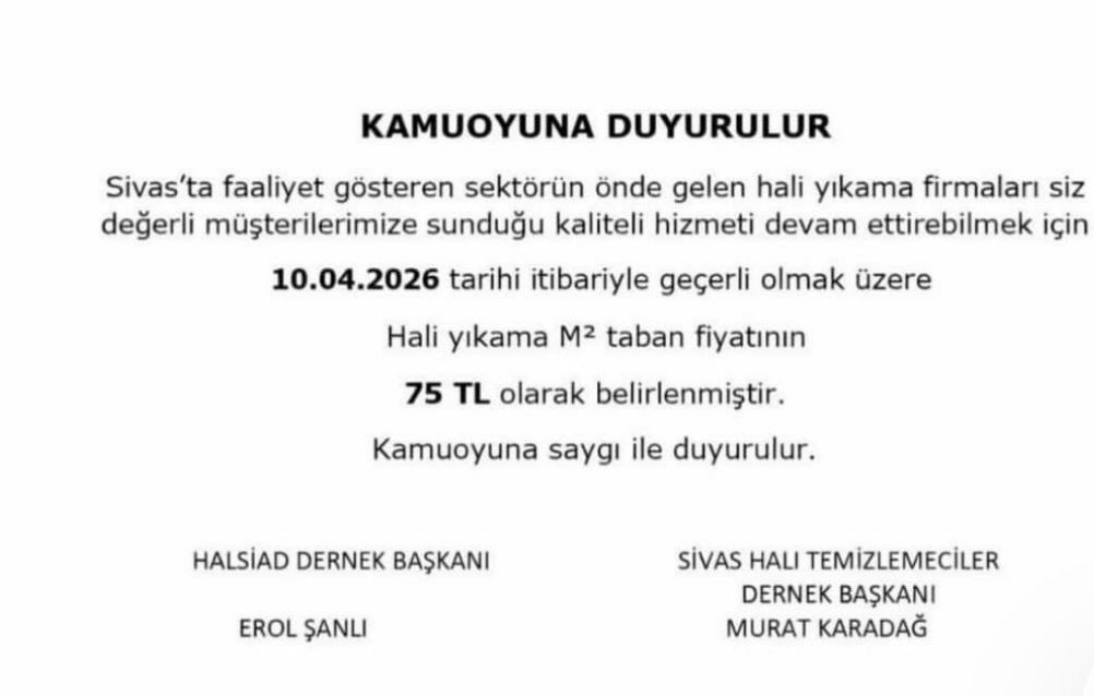 Ortak duyuru, HALSIAD Dernek Başkanı Erol Şanlı ile Sivas Halı Temizlemeciler Dernek Başkanı Murat Karadağ imzasıyla kamuoyuna paylaşıldı.