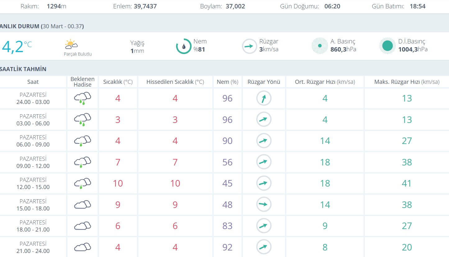 Saatlik verilere göre gece ve sabah saatlerinde sıcaklık 3 ila 4 derece arasında seyredecek. Sabah saatlerinden itibaren etkisini sürdüren yağışın gün içerisinde de aralıklarla devam etmesi öngörülüyor. Nem oranının özellikle gece saatlerinde yüzde 90’ın üzerine çıktığı görülürken, sabah saatlerinde de yüksek seviyelerde kalmaya devam edeceği tahmin ediliyor.