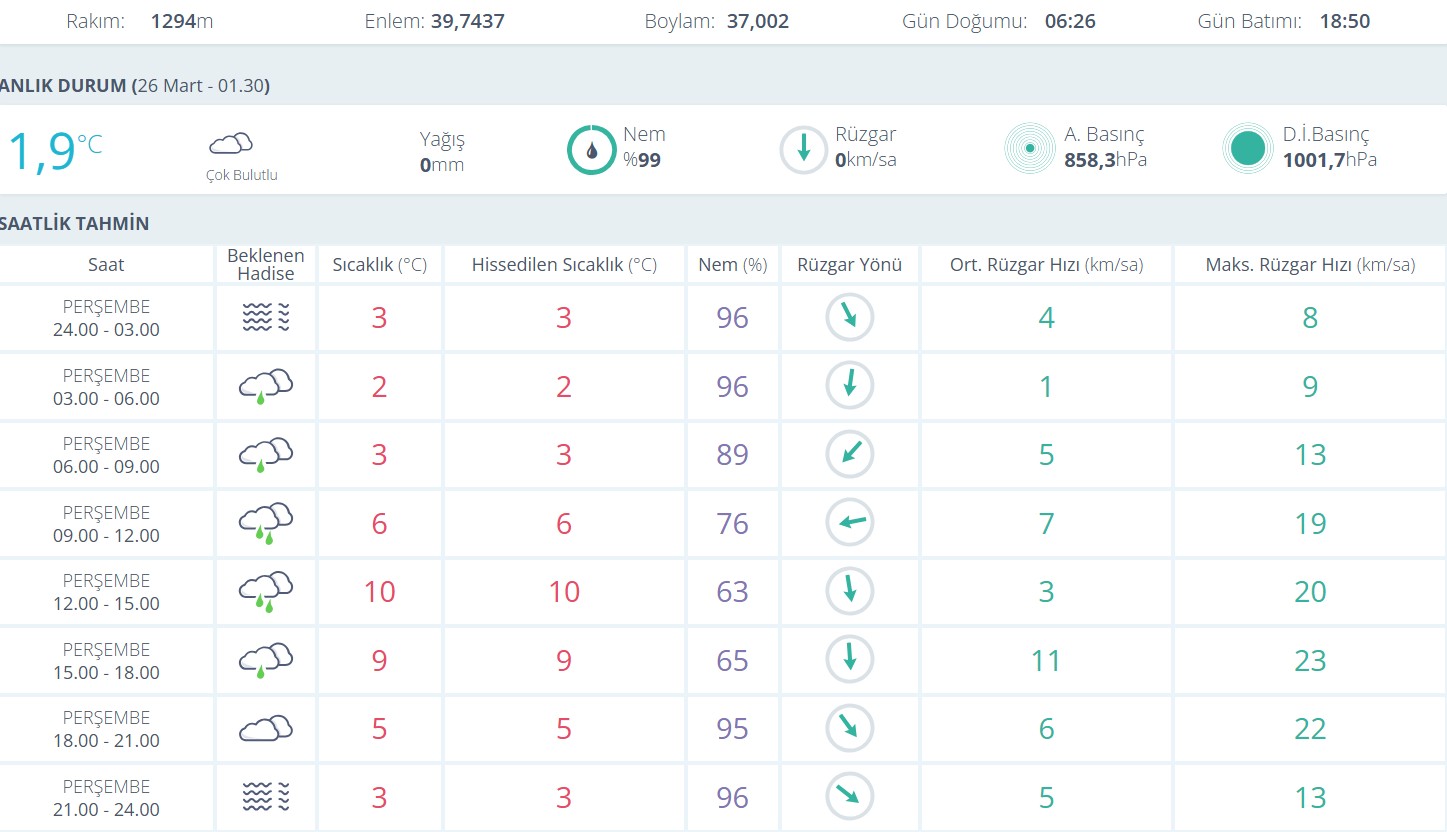 Meteorolojik verilere göre gece saatlerinde çok bulutlu bir hava hakim olurken, sabaha karşı saatlerde hafif yağış etkisini göstermeye başlayacak. Sabah 06.00 ile 09.00 saatleri arasında sıcaklığın 3 derece civarında seyretmesi beklenirken, nem oranının yüzde 80’in üzerinde olması dikkat çekiyor.