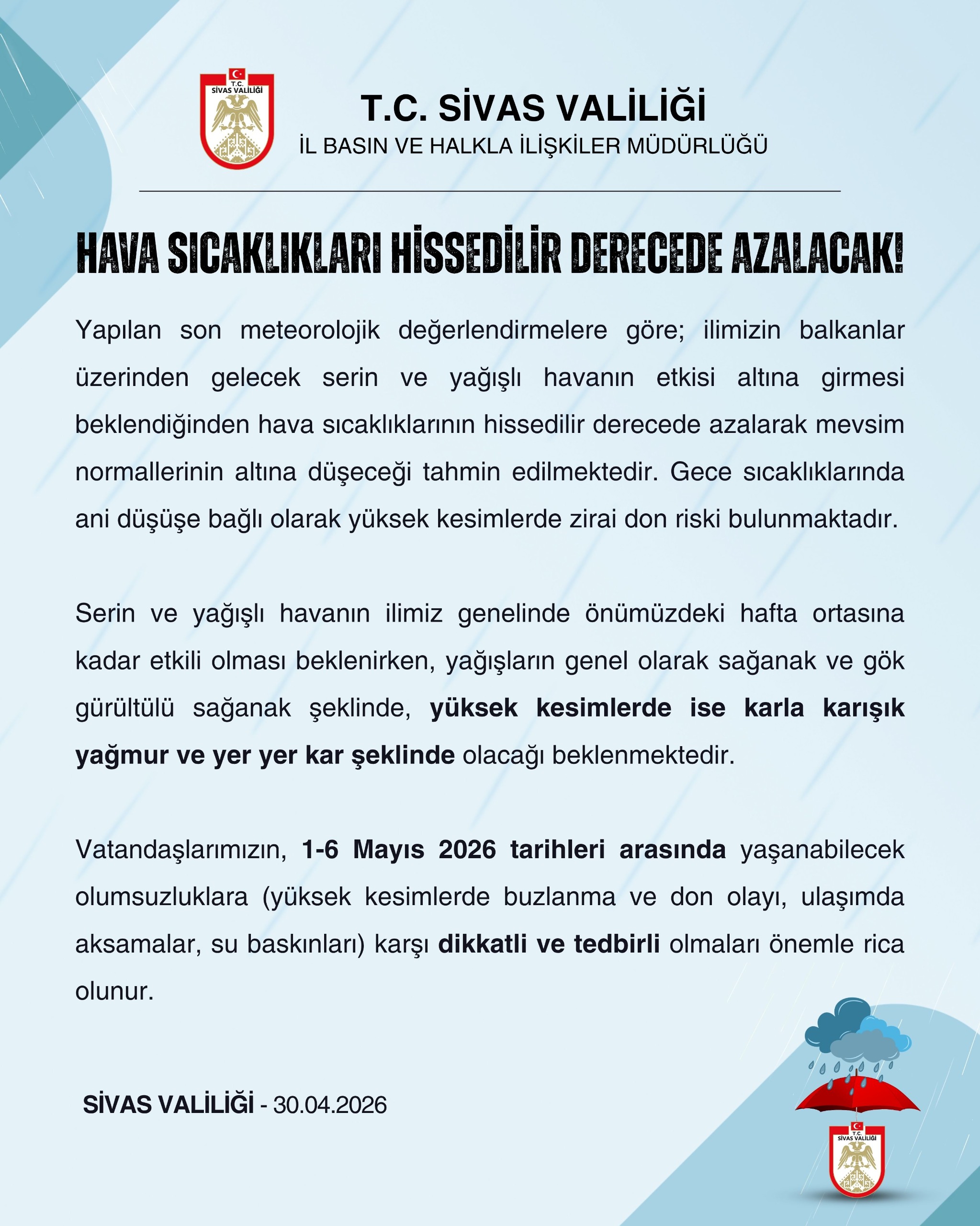 Sivas Valiliği, 1-6 Mayıs 2026 tarihleri arasında yaşanabilecek olumsuzluklara karşı vatandaşları uyardı. Özellikle yüksek kesimlerde buzlanma ve don olayları, ulaşımda aksamalar ve su baskınlarına karşı dikkatli ve tedbirli olunması gerektiği belirtildi.