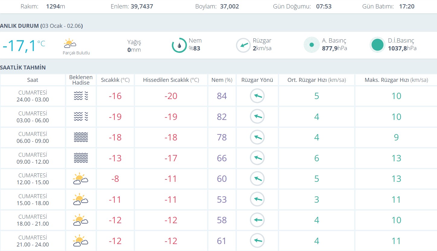 Saatlik tahminlere göre özellikle gece ve sabah erken saatlerde soğuk hava zirveye ulaşıyor. Gece yarısından sonra başlayan sert soğuklar, 03.00–06.00 saatleri arasında eksi 19 dereceye kadar düşerken, hissedilen sıcaklık da aynı seviyelerde ölçüldü. Sabah saatlerinde ise hava sıcaklığı eksi 18 derece civarında seyretti.