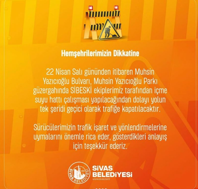Sivas Belediyesi, 22 Nisan Salı gününden itibaren Muhsin Yazıcıoğlu Bulvarı ve Muhsin Yazıcıoğlu Parkı güzergahında içme suyu hattı çalışmaları yapılacağını duyurdu.