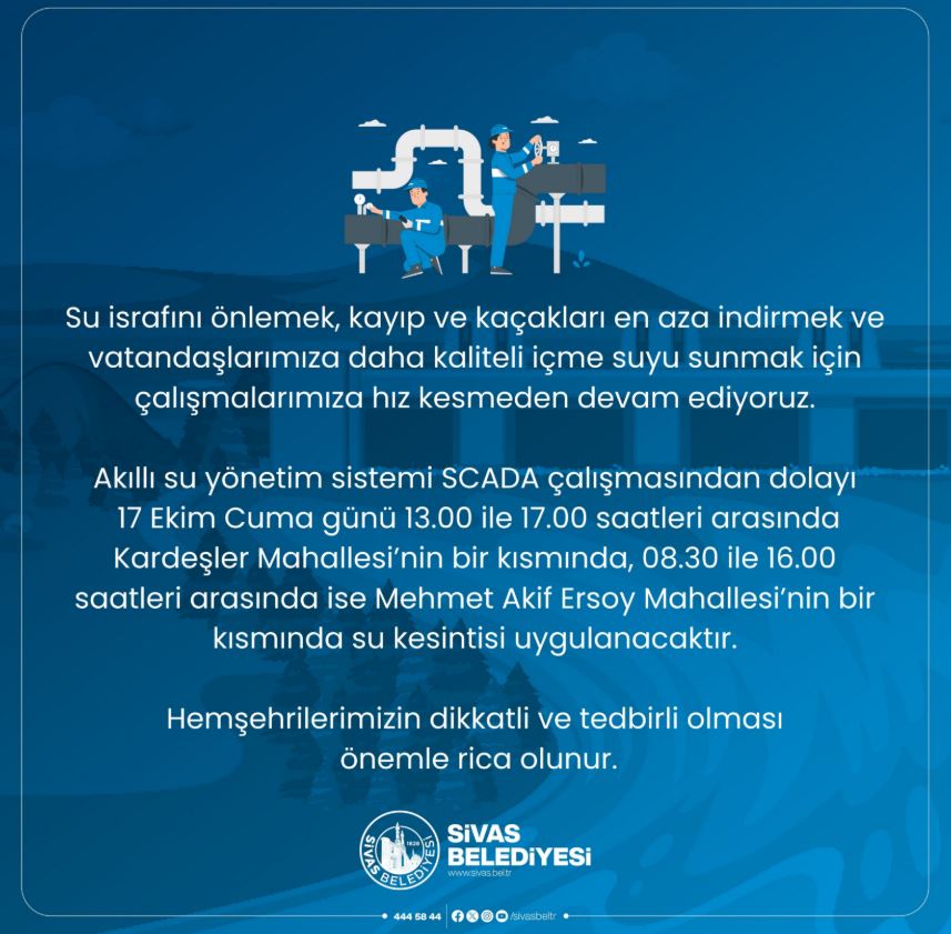 Sivas Belediyesi, akıllı su yönetim sistemi (SCADA) çalışmaları kapsamında bazı mahallelerde geçici su kesintisi uygulanacağını duyurdu.
