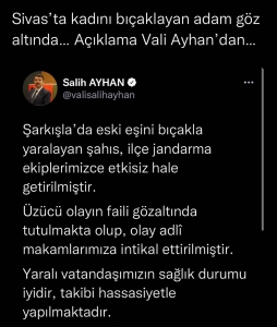 Sivas’ın Şarkışla ilçesinde sokak ortasında 3 yerinden bıçaklanan kadının saldırganı eski eş gözaltına alınırken Sivas Valisi Salih Ayhan açıklama yaptı.