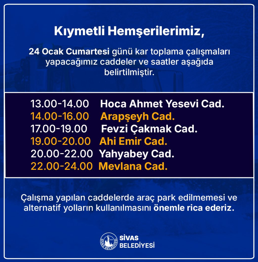 Sivas Belediyesi tarafından yapılan duyuruda, 24 Ocak Cumartesi günü kar toplama çalışması yapılacak cadde ve saatler kamuoyuyla paylaşıldı.