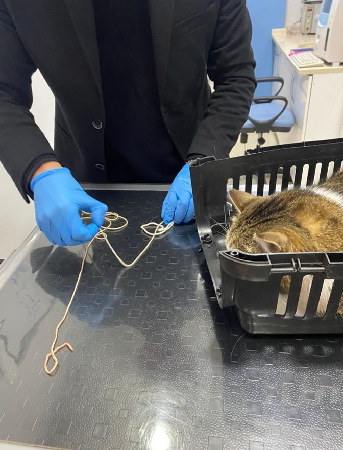 Sarıgül tarafından hemen kentteki bir veteriner kliniğine götürülen kedinin midesindeki ip, cerrahi müdahale olmadan ilaçlarla kusturularak çıkarıldı.