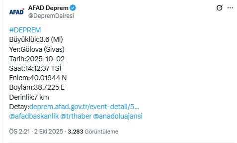Sivas’ın Gölova ilçesinde bugün öğle saatlerinde deprem meydana geldi.