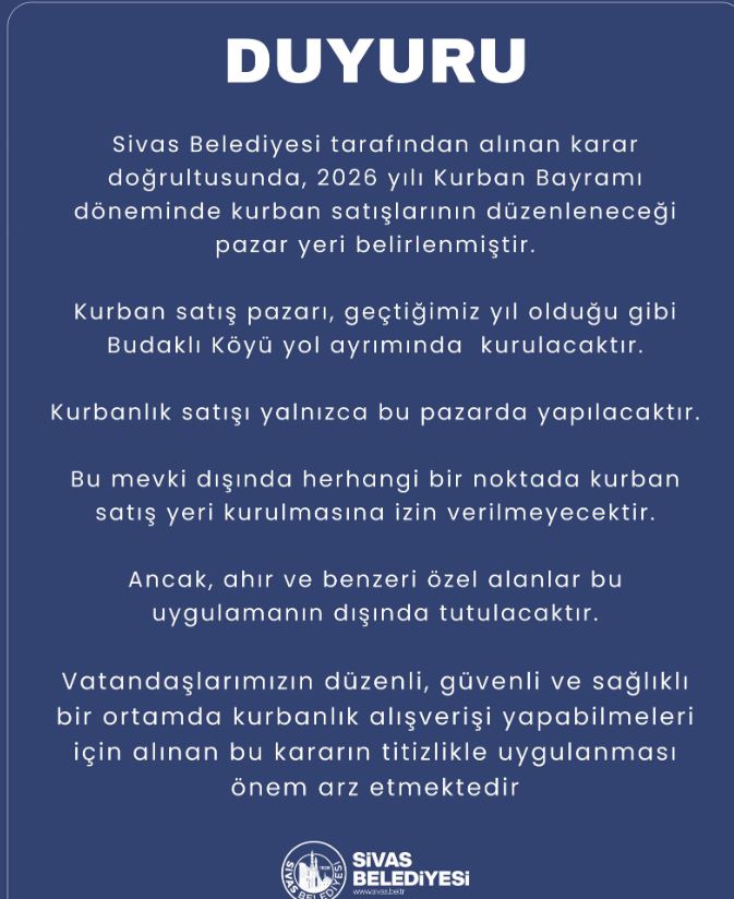 Sivas Belediyesi yetkilileri, alınan kararın vatandaşların düzenli, güvenli ve sağlıklı bir ortamda kurbanlık alışverişi yapabilmesi amacıyla hayata geçirildiğini kaydetti. Uygulamanın titizlikle denetleneceği ve kurallara uymayanlara gerekli işlemlerin yapılacağı da duyuruda yer aldı.