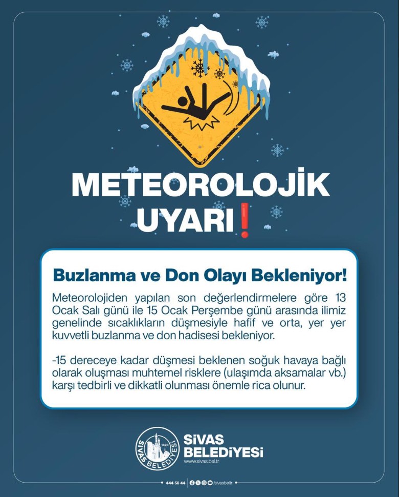 Sivas Belediyesi tarafından yapılan uyarıda, soğuk hava koşullarına bağlı olarak başta karayolları olmak üzere şehir içi ve kırsal bölgelerde kaygan zemin oluşabileceği belirtildi. Özellikle sabah erken saatlerde ve gece saatlerinde trafiğe çıkacak sürücülerin kış lastiği, zincir ve gerekli ekipmanları bulundurmaları istendi.