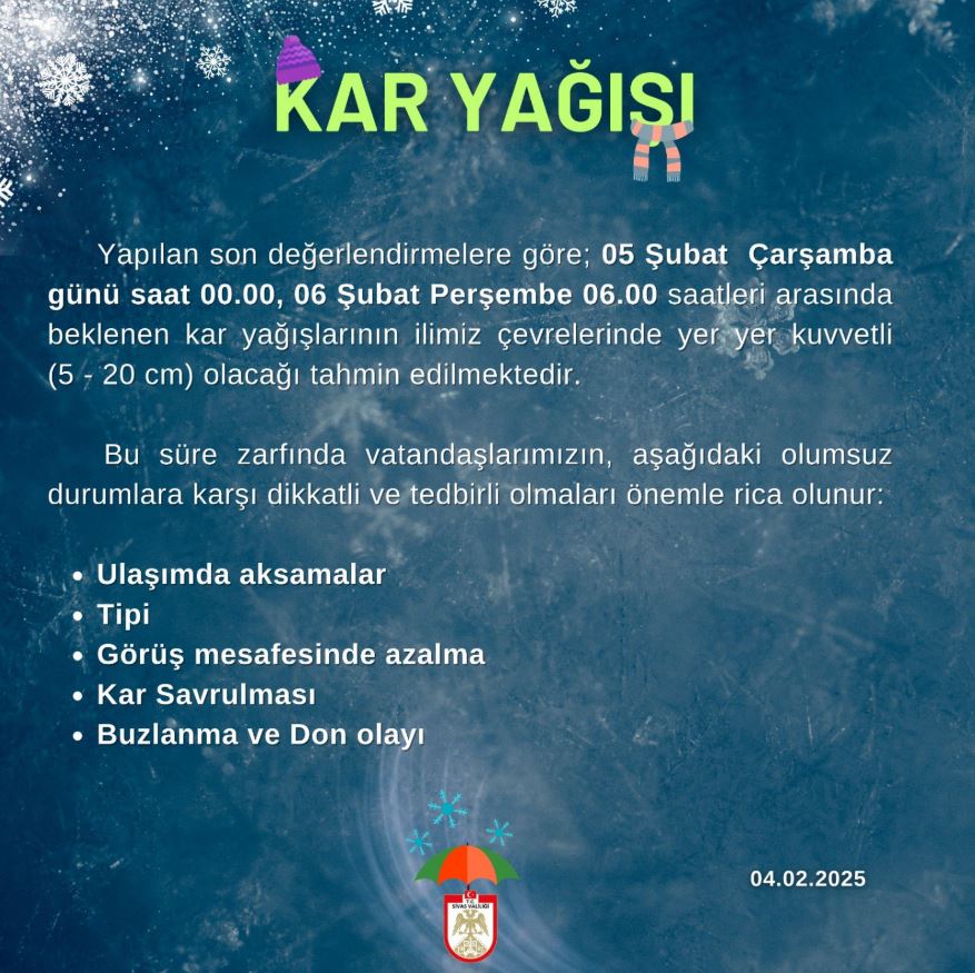 Meteoroloji’den yapılan son değerlendirmelere göre, 05 Şubat Çarşamba günü saat 00.00 ile 06 Şubat Perşembe günü 06.00 saatleri arasında Sivas genelinde kuvvetli kar yağışı bekleniyor.