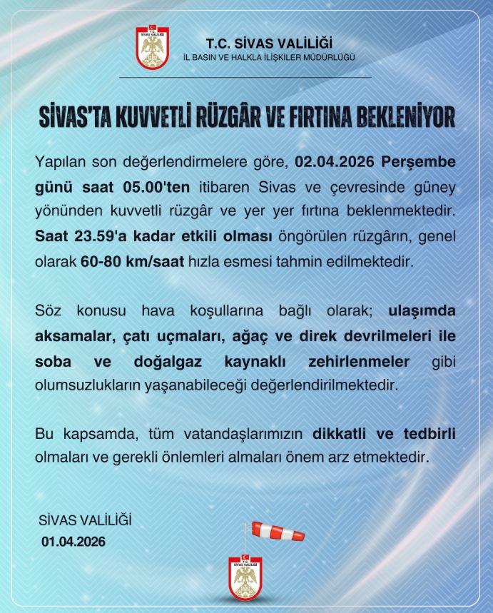 Sivas Valiliği tarafından yapılan açıklamada, tüm vatandaşların dikkatli ve tedbirli olmaları gerektiği vurgulanarak, olası olumsuzluklara karşı gerekli önlemlerin alınmasının önem taşıdığı belirtildi.