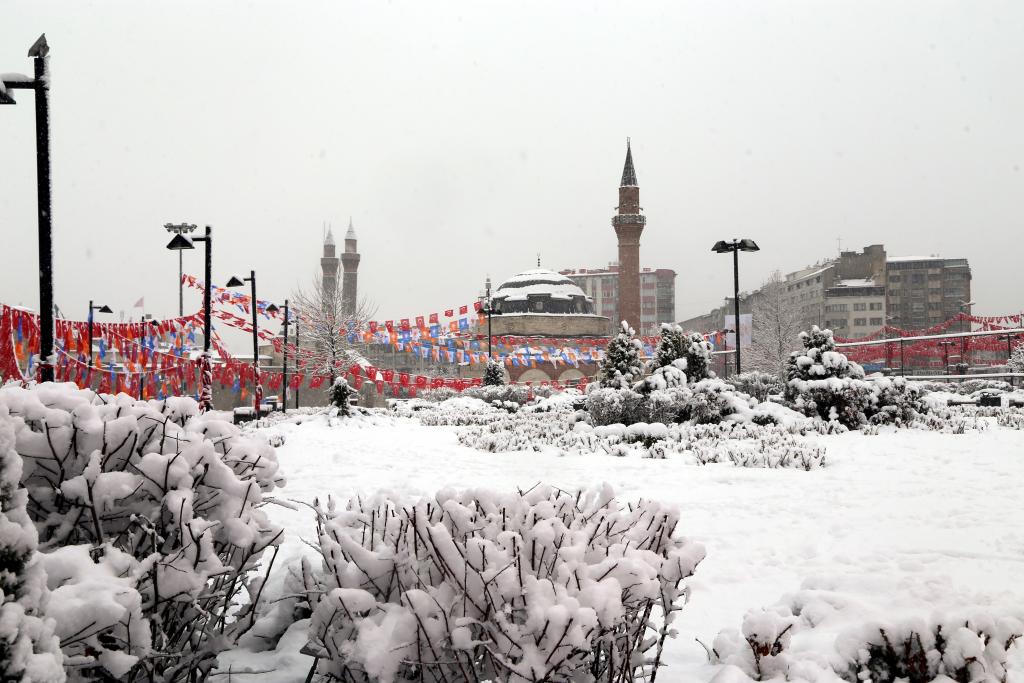Kar yağışının ardından tarihi kent meydanı beyaza bürünürken, ulaşımda zaman zaman aksamalar yaşandı.(AA)