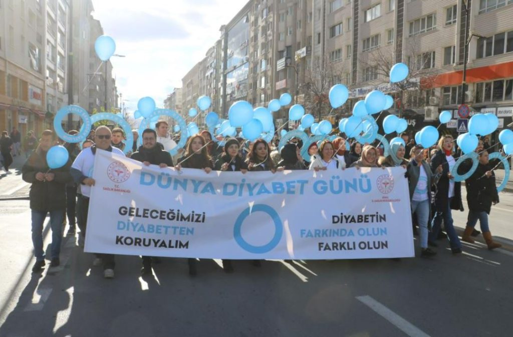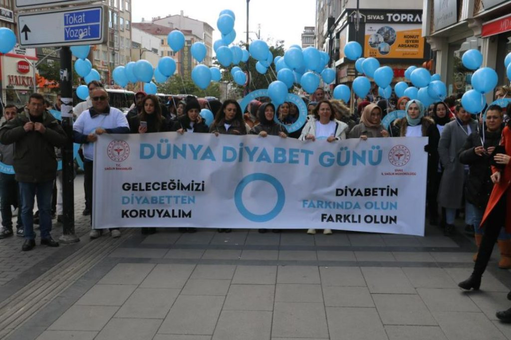 Sivas Sağlık Müdürlüğü Halk Sağlığı Başkanlığı tarafından organize edilen yürüyüş Sivas İnönü Bulvarında başlayıp Sivas Atatürk ve Kongre Müzesi bahçesinde tamamlandı. Yürüyüşe Sivas Valisi Dr. Yılmaz Şimşek’in eşi Çiğdem Şimşek, sağlık çalışanları ve vatandaşlar katıldı. ‘Geleceğimizi Diyabetten Koruyalım’ , ‘ Diyabetin Farkında Olun Farklı Olun’ yazılı pankart ve balonlarla yürüyen yaklaşık 100 kişi diyabete dikkat çekti. Dünya Diyabet Günü kapsamında basın açıklamasında bulunan Uzm. Dr. Esma Kılıç, “Diyabet, vücutta insülinin üretilmediği, az üretildiği veya üretilen insülinin etkili bir şekilde kullanılamadığı durumlarda ortaya çıkan, kan şekeri yüksekliğiyle seyreden kronik bir hastalıktır. Diyabet dünya çapında çok büyük bir sorun haline geldi. Uluslararası Diyabet Federasyonu (IDF), dünya genelinde 382 milyon yetişkinin diyabet hastası olduğu tahminin de bulundu. Diyabet görülme sıklığı pandemik oranlara ulaştı ve 2035 yılına kadar bu rakamın 592 milyon olması beklenmektedir. Yaşlanan nüfus, kentleşme ve değişen yaşam tarzları diğer kronik hastalıklarla birlikte diyabet pandemisini de hızla artırmaktadır. Uluslararası Diyabet Federasyonu (IDF) tarafından diyabetin yaygınlığı hakkında yayımlanan güncel veriler, Türkiye'de 20-79 yaş aralığında yaklaşık 7 milyon diyabet hastası olduğunu ve bu rakamın toplam yetişkin nüfusun yaklaşık yüzde 15'ine denk geldiğini göstermektedir” dedi.