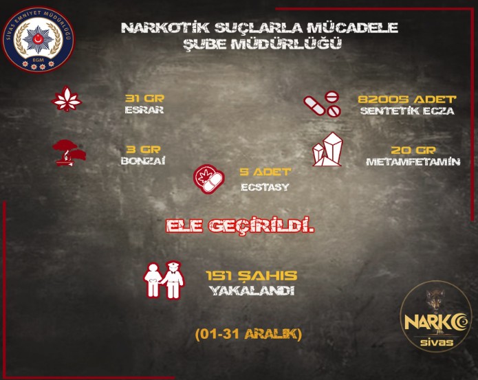 Sivas Emniyet Müdürlüğü Narkotik Suçlarla Mücadele Şube Müdürlüğü ekipleri tarafından 1-31 Aralık 2025 tarihleri arasında uyuşturucu madde ticareti ve kullanımına yönelik çok sayıda operasyon düzenlendi. Kent genelinde gerçekleştirilen çalışmalarda farklı tür ve miktarlarda uyuşturucu maddeler ele geçirildi.