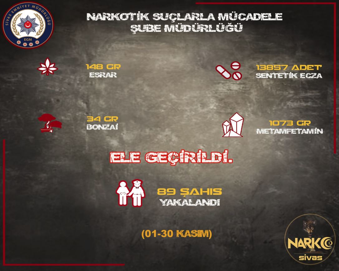 Sivas Emniyet Müdürlüğü Narkotik Suçlarla Mücadele Şube Müdürlüğü ekipleri, 1-30 Kasım tarihleri arasında kent genelinde gerçekleştirdiği operasyonların sonuçlarını paylaştı.