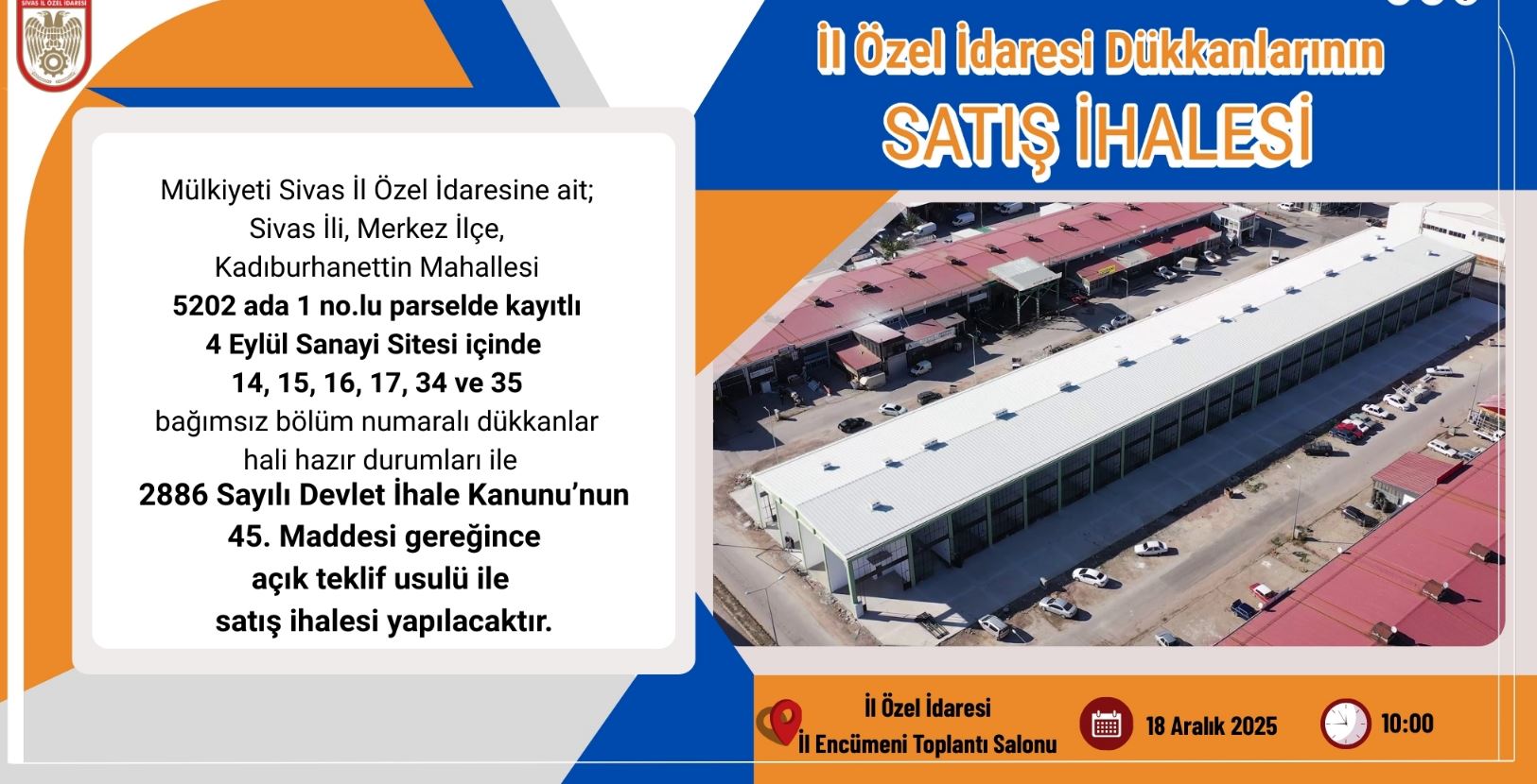 Mülkiyeti Sivas İl Özel İdaresine ait olan, Sivas ili Merkez ilçesi Kadıburhanettin Mahallesi 5202 ada 1 no’lu parselde kayıtlı bulunan 14, 15, 16, 17, 34 ve 35 numaralı bağımsız bölüm dükkanların mevcut halleriyle satışı gerçekleştirilecek. Satış işlemi, 2886 Sayılı Devlet İhale Kanunu’nun 45. maddesi kapsamında açık teklif usulüyle yapılacak.