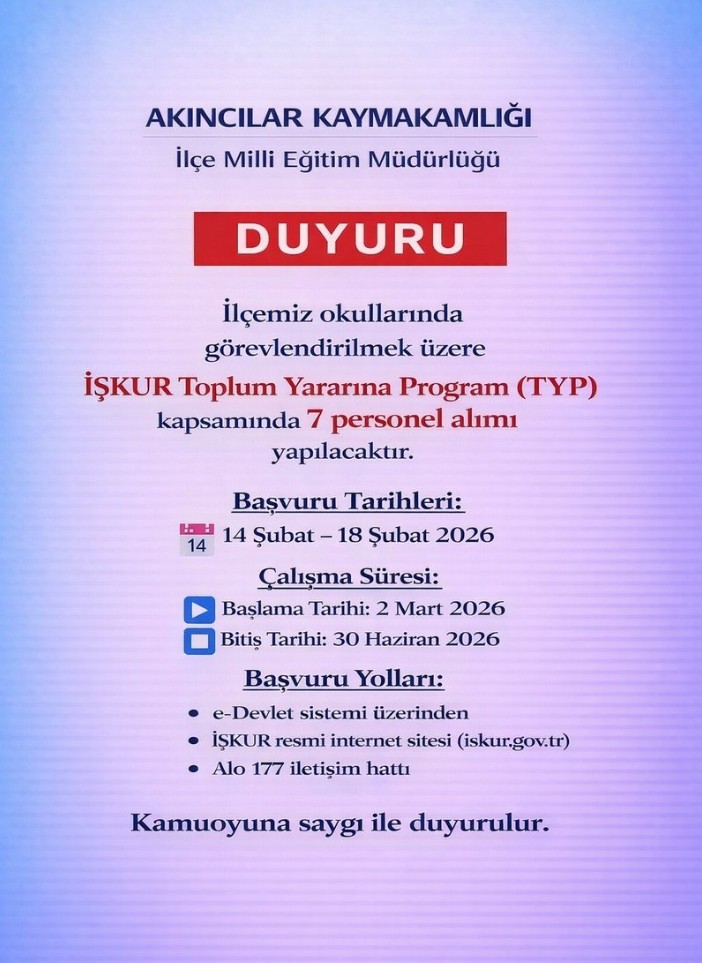 Akıncılar, İŞKUR personel alımı, TYP personel alımı, Akıncılar iş ilanı, kamu personel alımı, okul personel alımı, geçici istihdam, İŞKUR başvuru