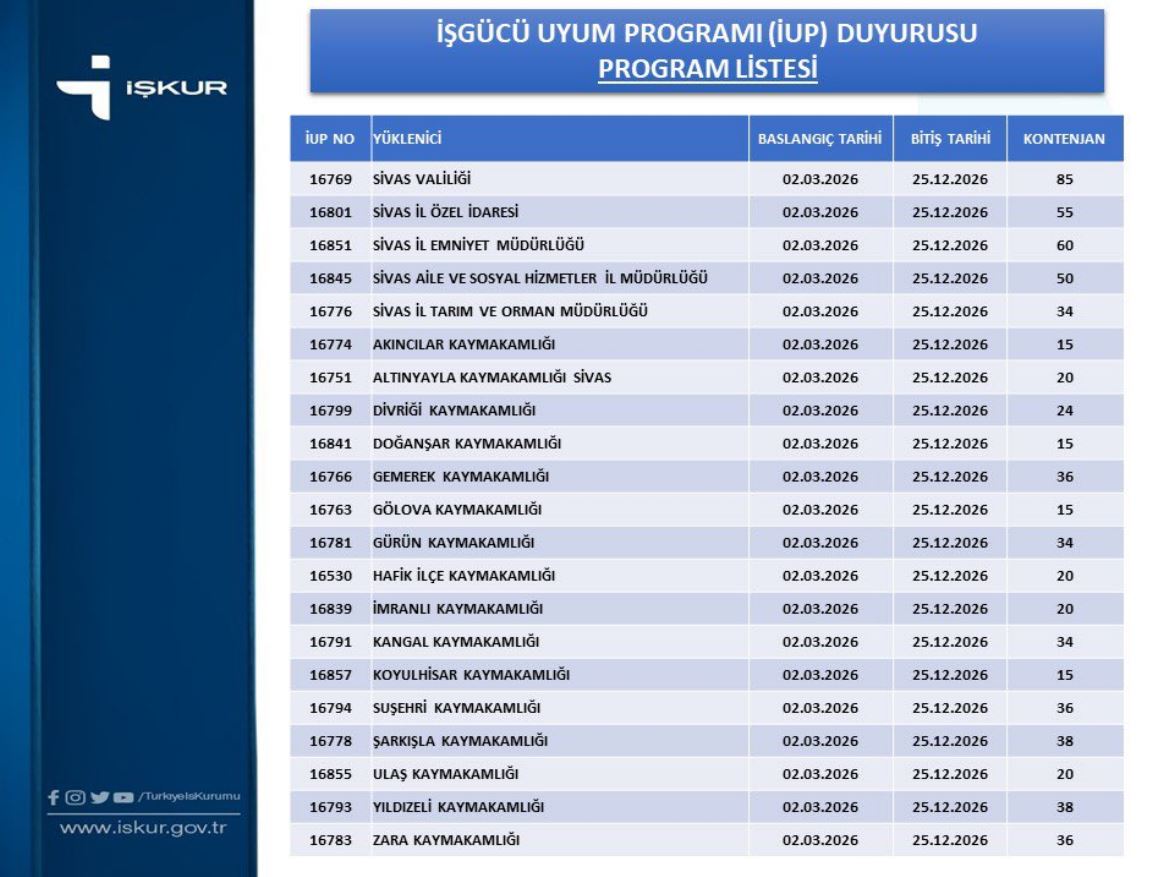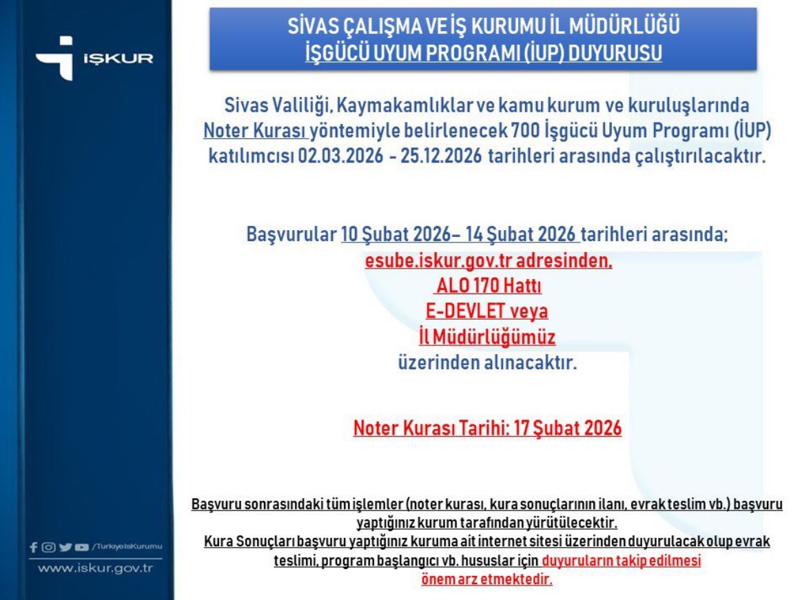 Sivas Çalışma ve İş Kurumu İl Müdürlüğü tarafından yapılan duyuruya göre, Sivas Valiliği, kaymakamlıklar ve çeşitli kamu kurumlarında görevlendirilmek üzere noter kurası yöntemiyle belirlenecek toplam 700 katılımcı, 2 Mart 2026 – 25 Aralık 2026 tarihleri arasında İşgücü Uyum Programı kapsamında çalıştırılacak.