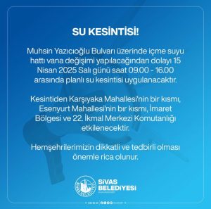 Sivas Belediyesi tarafından yapılan açıklamaya göre, Muhsin Yazıcıoğlu Bulvarı üzerinde içme suyu hattında vana değişimi yapılacağından dolayı 15 Nisan 2025 Salı günü saat 09.00 ile 16.00 arasında planlı su kesintisi gerçekleştirilecek.