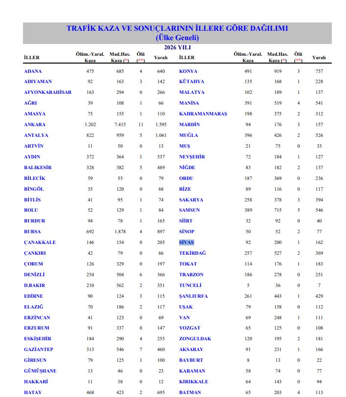 Sivas trafik kazası, Sivas ocak ayı kazaları, trafik istatistikleri, Sivas emniyet, Sivas jandarma, trafik güvenliği