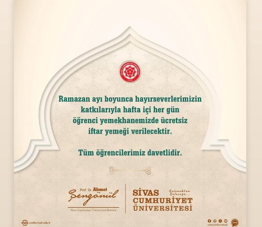 Sivas Cumhuriyet Üniversitesi, Ramazan ayı boyunca öğrencilerine ücretsiz iftar yemeği verecek.