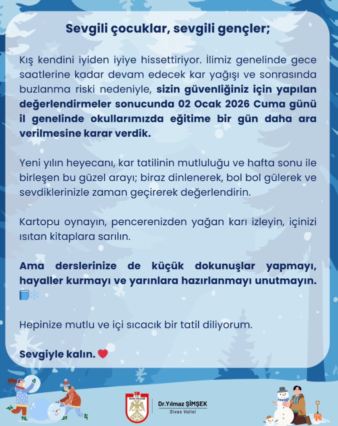 Yapılan değerlendirmeler sonucunda, 02 Ocak 2026 Cuma günü Sivas genelindeki tüm okullarda eğitime bir gün daha ara verilmesine karar verildi. Kar yağışı sonrası beklenen buzlanma ve don riskinin ulaşımda ve günlük yaşamda olumsuzluklara yol açabileceği ifade edildi.