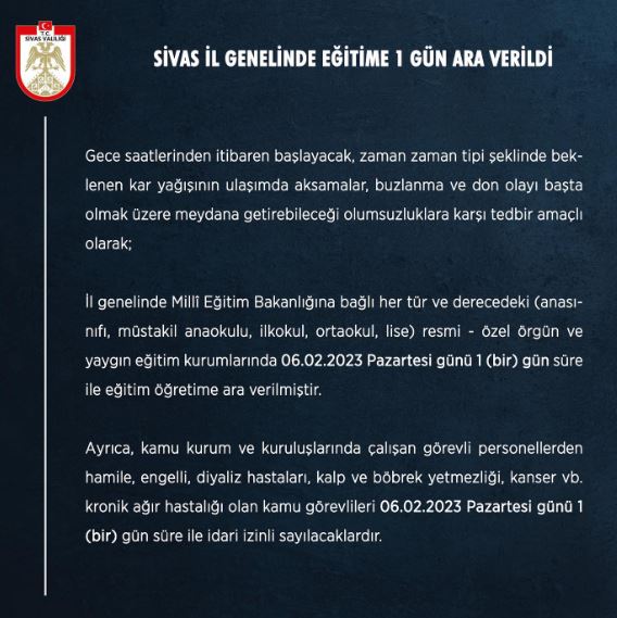 Vali Şimşek mesajında "Sivas genelinde beklenen yoğun kar yağışı nedeniyle 06.02.2023 Pazartesi günü 1 (bir) gün süreyle eğitime ara verilmesine karar verdik.