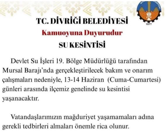 Sivas’ın Divriği ilçesinde 13-14 Haziran (Cuma-Cumartesi) tarihlerinde genel su kesintisi yaşanacak.