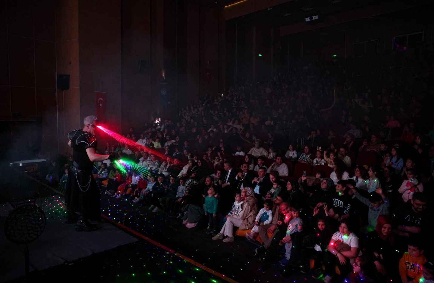 Programın devamında gerçekleştirilen lazer gösterisi ise ışık ve müziğin uyumuyla izleyicilere heyecan dolu anlar yaşattı. Gösteriler boyunca çocukların neşesi ve kahkahaları salonu doldururken, aileler de çocuklarının mutluluğuna ortak oldu.