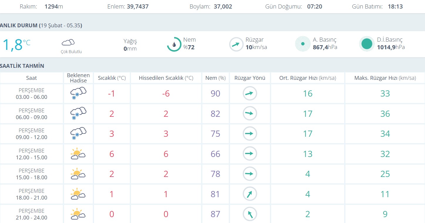 Meteoroloji verilerine göre Sivas’ta 19 Şubat sabah saatleri itibarıyla hava sıcaklığı 1,8 derece olarak ölçüldü. Kentte çok bulutlu bir gökyüzü hâkim olurken, nem oranının yüzde 72 seviyelerinde olduğu bildirildi. Rüzgârın saatte yaklaşık 10 kilometre hızla esmesi bekleniyor.