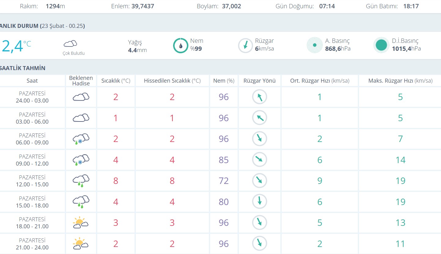 Öğle saatlerinde sıcaklığın 8 dereceye kadar yükselmesiyle birlikte yağışın yağmur şeklinde devam etmesi bekleniyor. Öğleden sonra sıcaklıkların yeniden düşüşe geçeceği, 15.00–18.00 saatleri arasında 4 derece seviyelerine gerileyeceği tahmin ediliyor. Akşam saatlerinde ise bulutluluğun sürmesiyle birlikte parçalı bulutlu bir gökyüzü öngörülüyor.