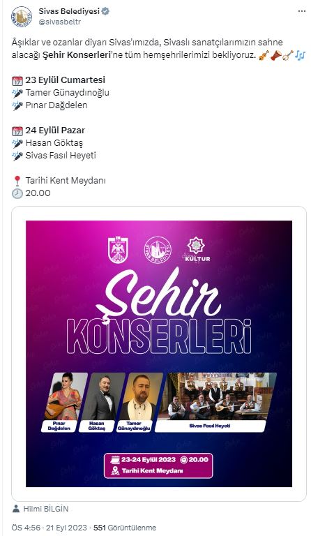 Sivas Belediye Başkanlığının sosyal medya hesabından yapılan açıklamada: "Âşıklar ve ozanlar diyarı Sivas'ımızda, Sivaslı sanatçılarımızın sahne alacağı Şehir Konserleri'ne tüm hemşehrilerimizi bekliyoruz. 🎻🪘🪕🎶