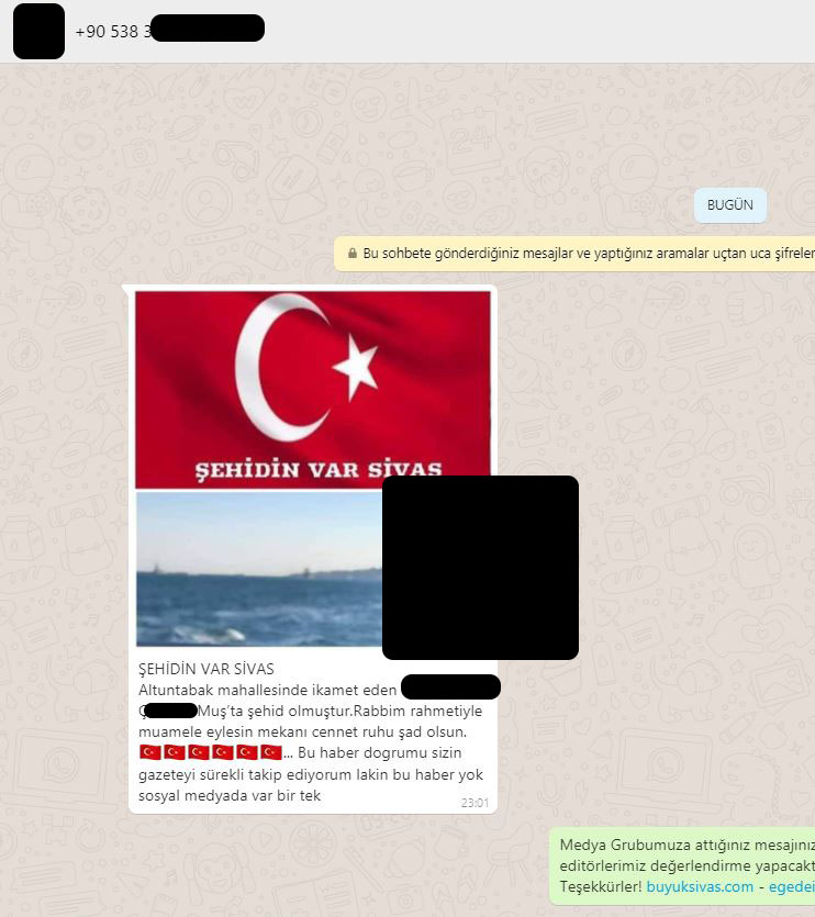 Sosyal medyada gün içerisinde dağılan "ŞEHİDİN VAR SİVAS!!" Altuntabak mahallesinde ikamet eden Uzman Çavuş Rxxxx Uxxx Çxxxxxx Muş’ta şehit olmuştur. Allah rahmet eylesin mekanı cennet ruhu şad olsun.Allah ailesine sabırlar versin. Başımız sağolsun" mesajı sonrası haber merkezimizi arayan çok sayıda vatandaş Sivas'ta Şehit mi var? sorusunu bizlere yöneltiyor.