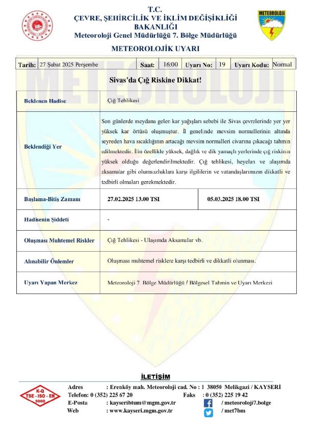 Meteoroloji Genel Müdürlüğü 7. Bölge Müdürlüğü tarafından yapılan açıklamada, Sivas ve çevresinde çığ tehlikesine karşı dikkatli olunması gerektiği belirtildi.